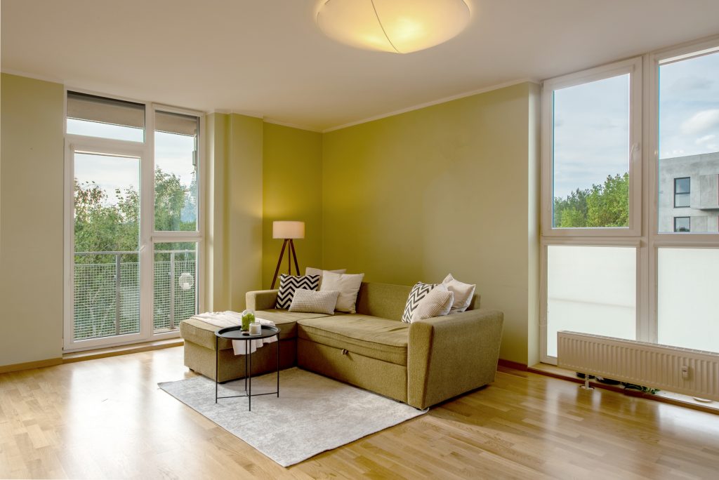 Stylish modern living room featuring large windows for ample natural light.